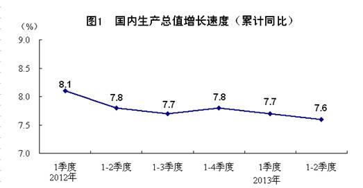2012年各季度及2013年一、二季度GDP环比增速分别为1.5%、2.1%、2.0%、1.9%、1.6%和1.7%。