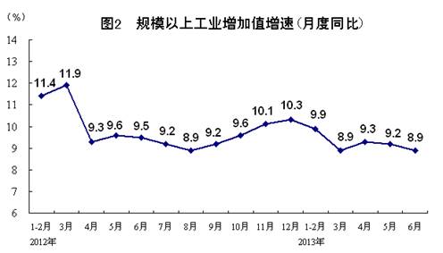 上半年,全国规模以上工业增加值按可比价格计算同比增长9.3%,增速比一季度回落0.2个百分点。分经济类型看,国有及国有控股企业增加值同比增长5.2%,集体企业增长5.0%,股份制企业增长10.9%,外商及港澳台商投资企业增长7.4%。分轻重工业看,重工业增加值同比增长9.6%,轻工业增长8.4%。分行业看,41个工业大类行业增加值全部实现同比增长。分地区看,东部地区增加值同比增长8.7%,中部地区增长10.0%,西部地区增长10.5%。分产品看,上半年464种产品中有325种产品同比增长。其中,发电量增长4.4%,粗钢增长7.4%,钢材增长10.2%,水泥增长9.7%,平板玻璃增长10.8%,十种有色金属增长10.0%,焦炭增长7.4%,硫酸(折100%)增长7.3%,烧碱(折100%)增长4.7%,化学纤维增长5.8%,乙烯增长4.6%,微型计算机设备增长6.4%,集成电路增长9.8%,汽车增长15.2%,其中轿车增长16.1%。上半年规模以上工业企业产销率达到97.5%,与上年同期持平。规模以上工业企业实现出口交货值53426亿元,同比增长4.8%。6月份,规模以上工业增加值同比增长8.9%,环比增长0.68%。