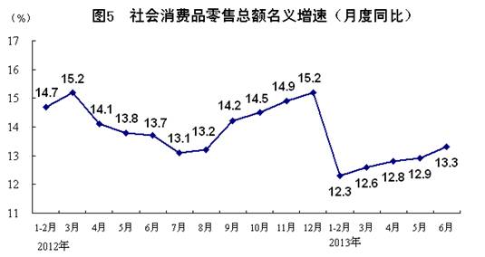 上半年,社会消费品零售总额110764亿元,同比名义增长12.7%(扣除价格因素实际增长11.4%),增速比一季度加快0.3个百分点,比上年同期回落1.7个百分点。其中,限额以上企业(单位)消费品零售额55251亿元,同比增长10.5%。按经营单位所在地分,城镇消费品零售额95789亿元,同比增长12.5%;乡村消费品零售额14975亿元,增长14.3%。按消费形态分,餐饮收入11795亿元,同比增长8.7%,增速比一季度加快0.2个百分点,比上年同期回落4.5个百分点;商品零售98969亿元,增长13.2%,比一季度加快0.3个百分点,比上年同期回落1.3个百分点。在商品零售中,限额以上企业(单位)商品零售额51508亿元,增长11.7%。其中,汽车类增长8.8%,增速比上年同期回落0.3个百分点;家具类增长21.3%,比上年同期回落3.8个百分点;家用电器和音像器材类增长15.3%,比上年同期加快12.0个百分点。6月份,社会消费品零售总额同比名义增长13.3%(扣除价格因素实际增长11.7%),环比增长1.26%。