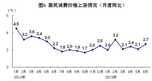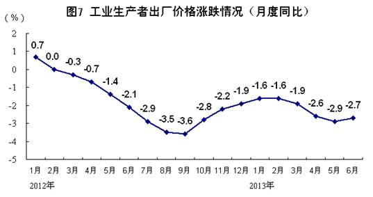 上半年,居民消费价格同比上涨2.4%,涨幅与一季度持平,比上年同期回落0.9个百分点。其中,城市上涨2.4%,农村上涨2.5%。分类别看,食品价格上涨4.0%,烟酒及用品上涨0.8%,衣着上涨2.4%,家庭设备用品及维修服务上涨1.6%,医疗保健和个人用品上涨1.6%,交通和通信下降0.6%,娱乐教育文化用品及服务上涨1.4%,居住上涨2.9%。在食品价格中,粮食价格同比上涨5.1%,油脂价格上涨3.3%,猪肉价格下降3.7%,鲜菜价格上涨2.3%。6月份,居民消费价格同比上涨2.7%,环比持平(涨跌幅度为0)。上半年工业生产者出厂价格同比下降2.2%,降幅比一季度扩大0.5个百分点,比去年同期扩大 1.6个百分点;6月份同比下降2.7%,环比下降0.6%。上半年工业生产者购进价格同比下降2.4%;6月份同比下降2.6%,环比下降0.5%。