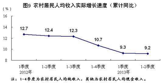 上半年,城镇居民人均总收入14913元。其中,城镇居民人均可支配收入13649元,同比名义增长9.1%;扣除价格因素实际增长6.5%,增速比一季度回落0.2个百分点。在城镇居民人均总收入中,工资性收入同比名义增长8.7%,经营净收入增长8.5%,财产性收入增长14.0%,转移性收入增长9.4%。农村居民人均现金收入4817元,同比名义增长11.9%;扣除价格因素实际增长9.2%,增速比一季度回落0.1个百分点。其中,工资性收入同比名义增长16.8%,家庭经营收入增长7.6%,财产性收入增长22.6%,转移性收入增长14.4%。上半年城镇居民人均可支配收入中位数11938元,同比名义增长9.2%;农村居民人均现金收入中位数4171元,增长13.0%。6月末,农村外出务工劳动力17111万人,同比增加444万人,增长2.7%。外出务工劳动力月均收入2477元,同比增长12.6%。