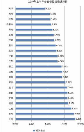 海南和天津两省份上半年经济增速排名末尾。其中,海南上半年GDP同比增长5.3%,暂时排名倒数第二。海南政府工作报告将今年的GDP增速目标上调为7%-7.5%,要完成这一目标,海南还有很大努力空间。