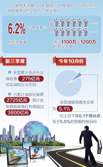 数据显示,今年前三季度,我国GDP保持了6.2%的增速。这一增速虽然没有前些年那么高,但随着GDP总量的不断扩大,GDP每增长1个点,对就业的拉动作用也相应增强。据相关测算,目前我国GDP每增长1个百分点,能够带动约200万个就业岗位。6.2%的经济增速,意味着带动1100万至1200万的就业人数。