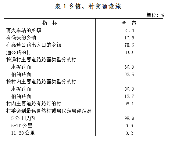 我市100%的村通公路,99.1%的村内主要道路有路灯。村委会到最远自然村、居民定居点距离以5公里以内为主。