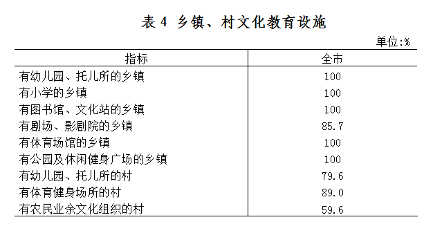 2016年末,我市100%的乡镇有幼儿园、托儿所,100%的乡镇有小学,100%的乡镇有图书馆、文化站,85.7%的乡镇有剧场、影剧院,100%的乡镇有体育场馆,100%的乡镇有公园及休闲健身广场。