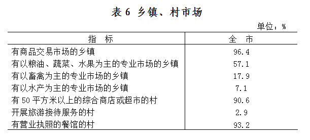 我市90.6%的村有50平方米以上的综合商店或超市,2.9%的村开展旅游接待服务,93.2%的村有营业执照的餐馆。