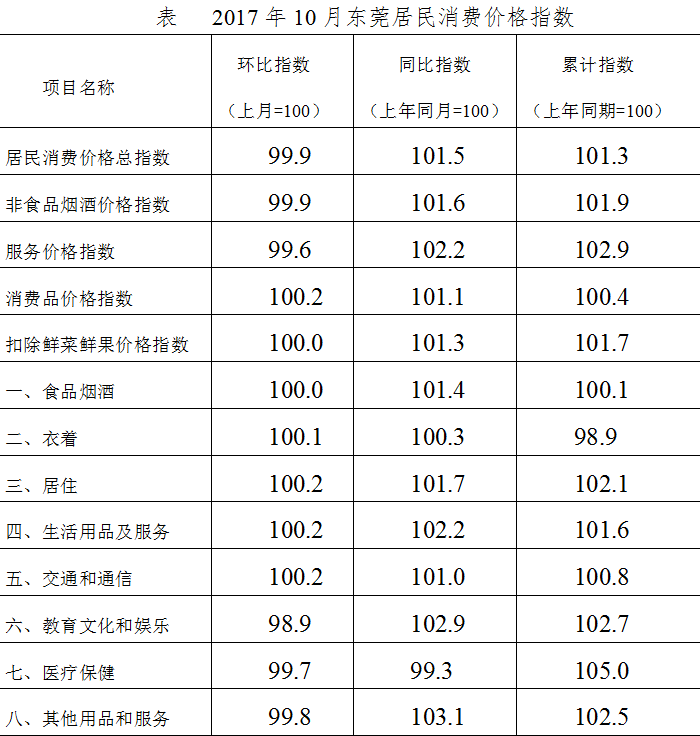 2017年10月份,东莞居民消费价格总水平(CPI)环比下降0.1%,同比上涨1.5%;1-10月平均,东莞居民消费价格总水平同比上涨1.3%。
