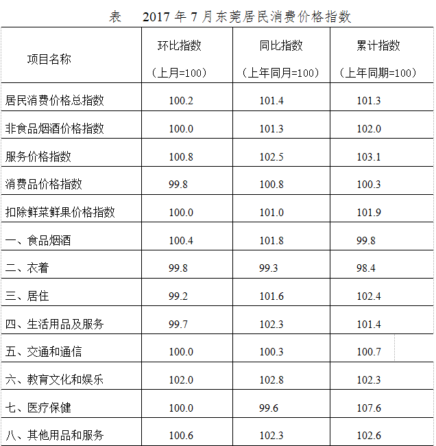 2017年7月份,东莞居民消费价格总水平(CPI)环比上涨0.2%,同比上涨1.4%;1-7月份累计上涨1.3%。