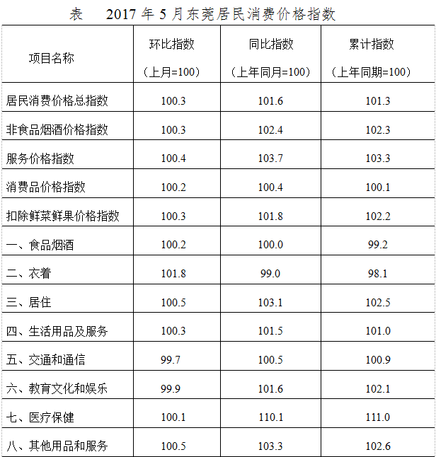 2017年5月份,东莞居民消费价格总水平(CPI)环比上涨0.3%,同比上涨1.6%;1-5月平均,东莞居民消费价格总水平同比上涨1.3%。