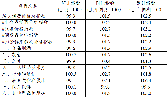 服务价格下降0.3%,消费品价格与上月持平,非食品烟酒价格与上月持平,扣除鲜菜鲜果价格下降0.1%。