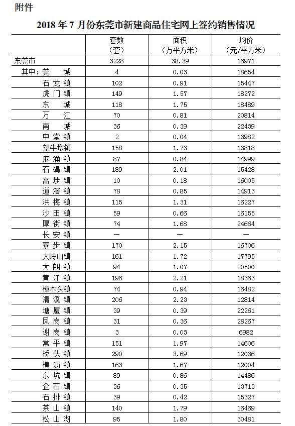 附件:2018年7月份东莞市新建商品住宅网上签约销售情况