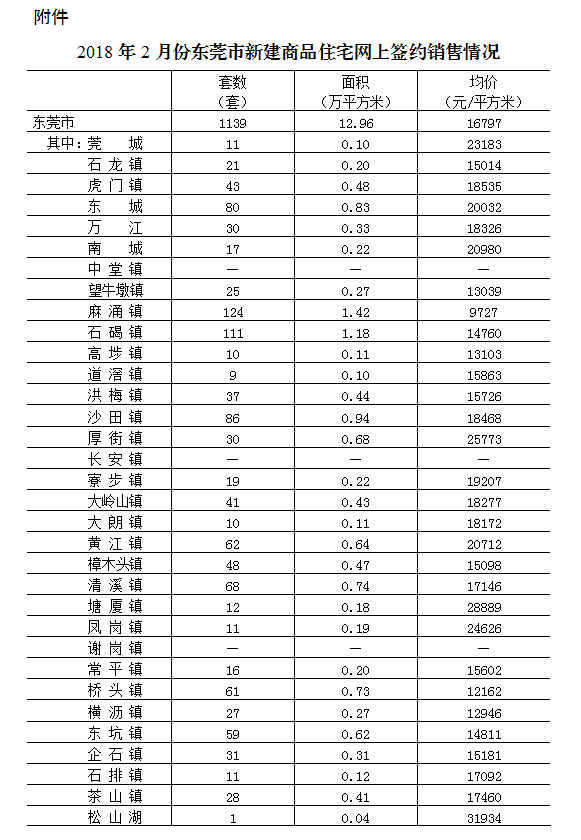 附件:2018年2月份东莞市新建商品住宅网上签约销售情况