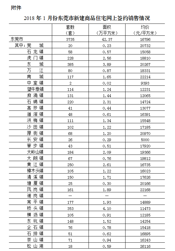附件:2018年1月份东莞市新建商品住宅网上签约销售情况