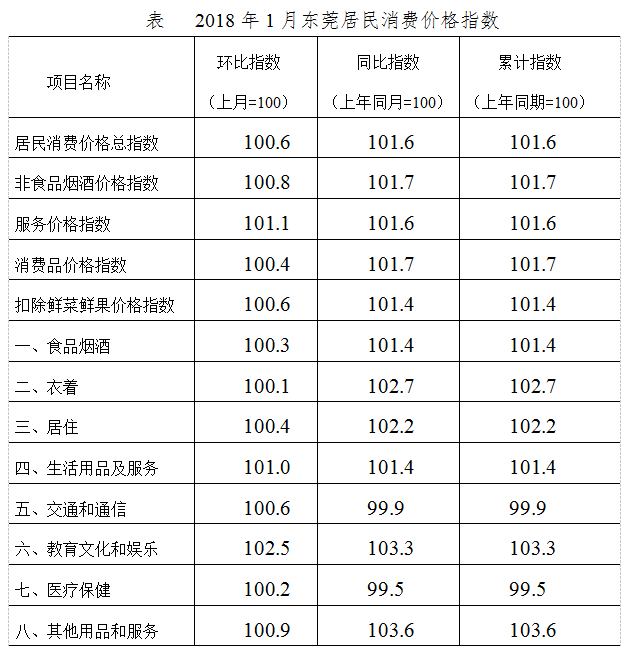 2018年1月份,东莞居民消费价格总水平(CPI)环比上涨0.6%,同比上涨1.6%。