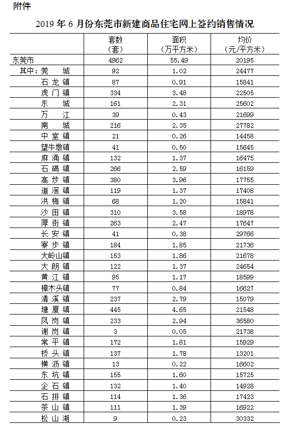 附件:2019年6月份东莞市新建商品住宅网上签约销售情况