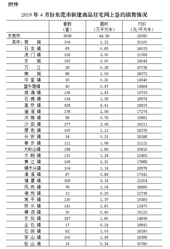 附件:2019年4月份东莞市新建商品住宅网上签约销售情况
