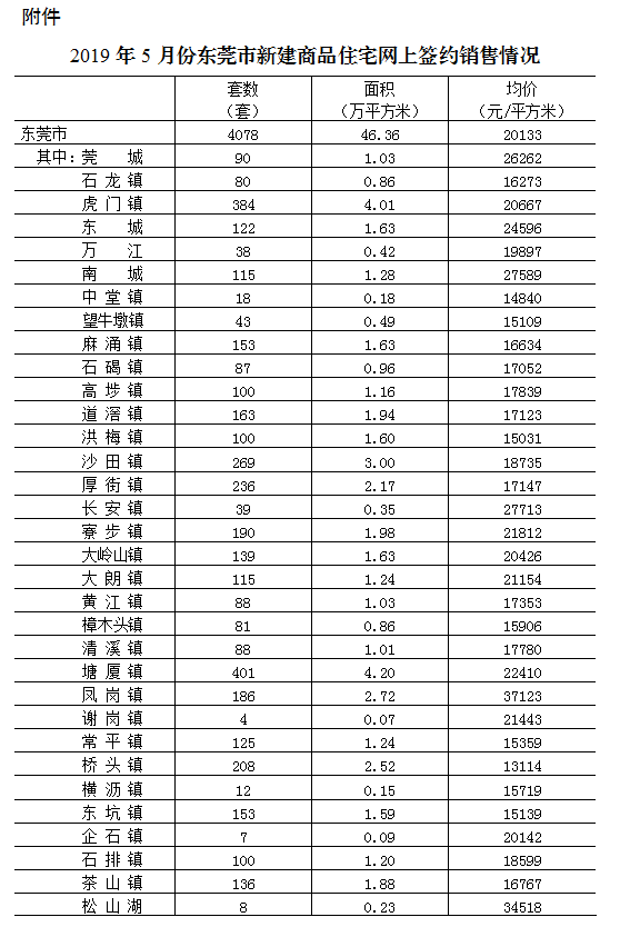 附件:2019年5月份东莞市新建商品住宅网上签约销售情况