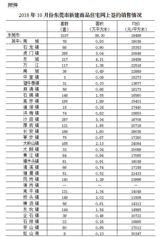 附件:2018年10月份东莞市新建商品住宅网上签约销售情况