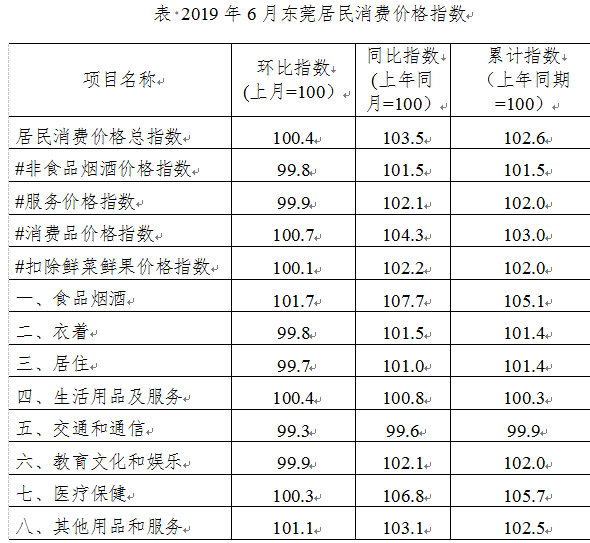 2019年6月份,东莞居民消费价格总水平(CPI)环比上涨0.4%,同比上涨3.5%;1-6月平均,东莞居民消费价格总水平同比上涨2.6%。