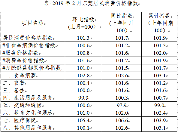 2019年2月份,东莞居民消费价格总水平(CPI)环比上涨1.3%,同比上涨1.7%;1-2月平均,东莞居民消费价格总水平同比上涨1.9%。