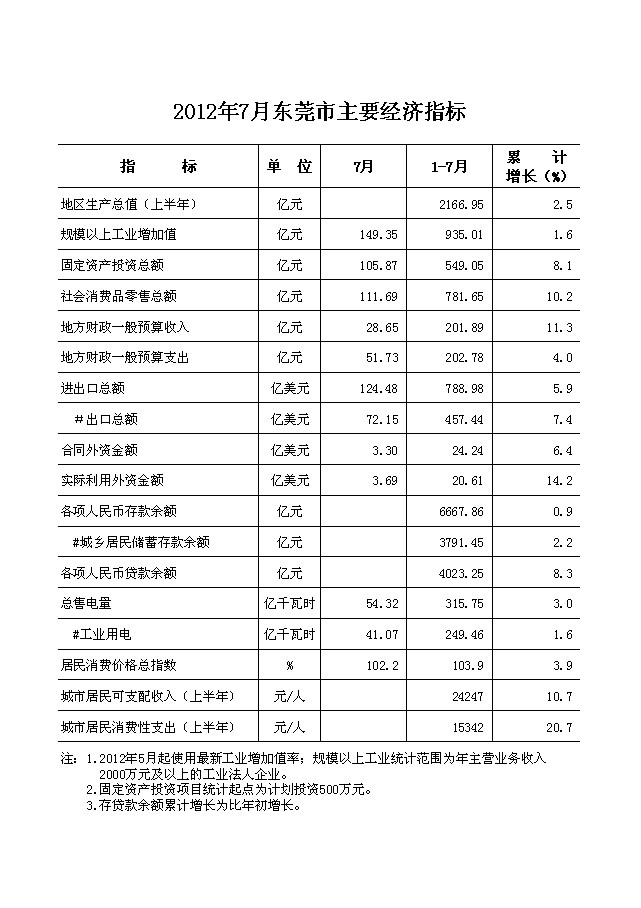 2012年7月东莞市主要经济指标