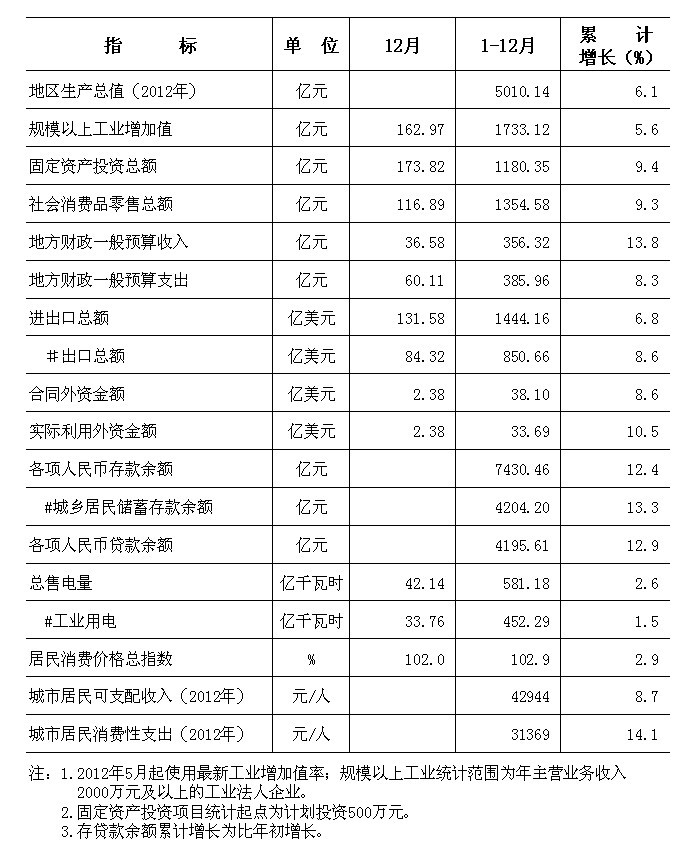 2012年12月东莞市主要经济指标
