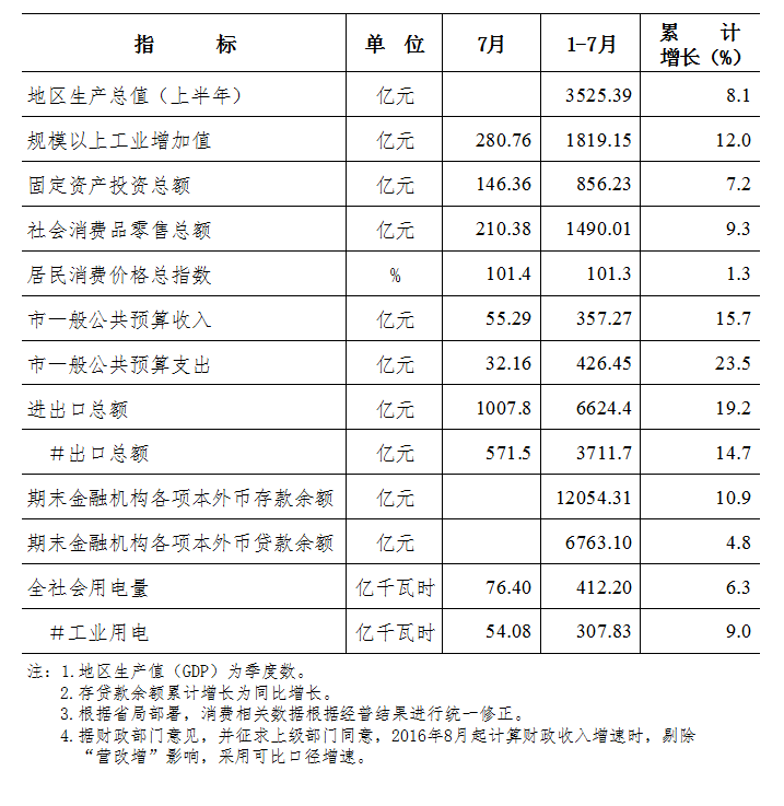 2017年1-7月东莞市主要经济指标