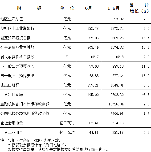2016年1-6月东莞市主要经济指标