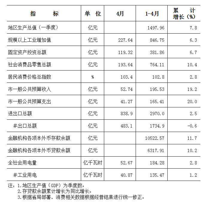2016年1-4月东莞市主要经济指标