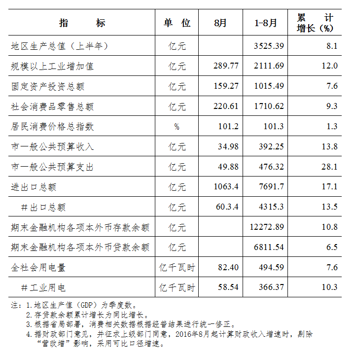 2017年1-8月东莞市主要经济指标