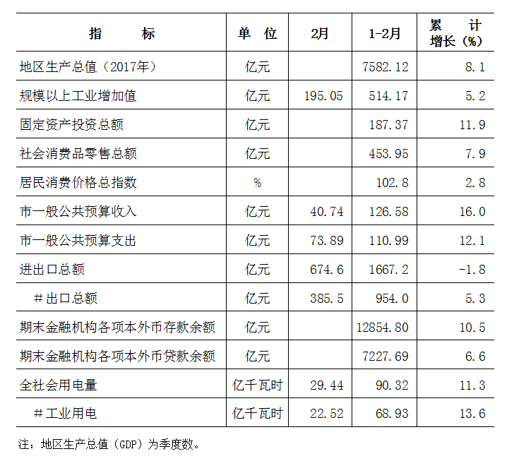 2018年1-2月东莞市主要经济指标