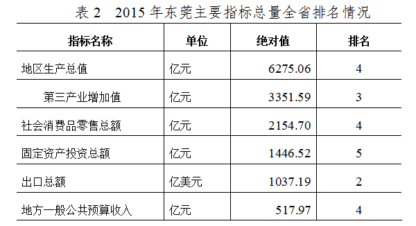 根据 “2015年广东省各市国民经济主要统计指标排序”,2015年东莞市各项主要指标总量排名靠前。2015年地区生产总值6275.06亿元,在全省排名第四;第三产业增加值3351.59亿元,在全省排名第三;社会消费品零售总额2154.70亿元,在全省排名第四;固定资产投资总额1446.52亿元,在全省排名第五;出口总额1037.19亿美元,在全省排名第二;地方一般公共预算收入517.97亿元,在全省排名第四(详见表2)。