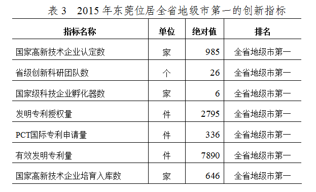 随着“东莞制造2025战略”、“科技东莞”、“机器换人”等政策的实施,全市创新驱动持续增强。多项创新指标全省排名靠前,2015年,全市拥有国家高新技术企业认定数985家,省级创新科研团队数26个,国家级科技企业孵化器数6家,发明专利授权量2795件,PCT国际专利申请量336件,有效发明专利量7890件,国家高新技术企业培育入库数646家,均在全省地级市排名第一。表明东莞经济创新有潜力,发展后劲不断增强。