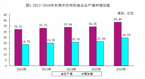 十八大以来,东莞农业经济保持稳定增长。2016年,全市农林牧渔业实现总产值38.44亿元,增加值24.62亿元,比2012年分别增加6.43亿元和5.87亿元,年均增长4.7%和7%;农村居民人均可支配收入26526元,比2012年增长44%,年均增长9.5%(详见图1)。