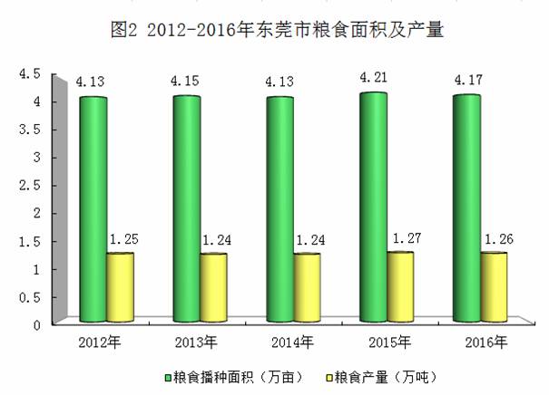 粮食生产基础地位稳固。受耕地资源限制,东莞粮食播种面积增幅有限,但我市加大农业基础设施投入,贯彻落实种粮补贴等惠农政策,并积极推进现代农业发展,2012 -2016年,全市粮食播种面积保持4万亩以上,亩产保持300公斤以上,粮食总产量保持在1万吨以上,粮食产量保持稳定(详见图2)。
