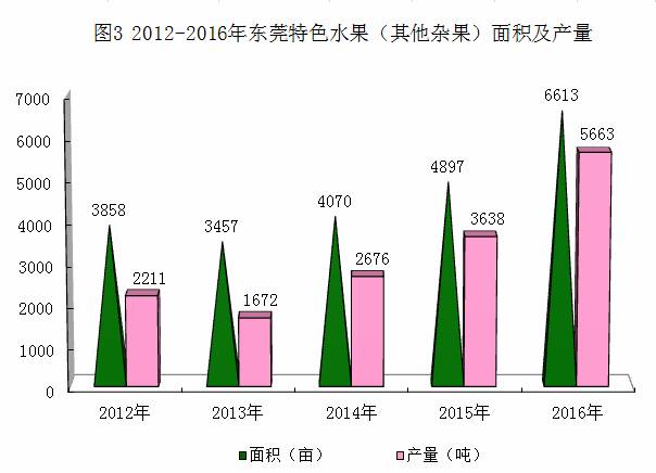 十八大以来,东莞大力发展特色农业生产,鲜切花、盆栽植物、特色水果等优势、经济价值高的农产品种植面积、产量不断增长。2016年,全市花卉盆栽等园艺作物总产值1.34亿元,比2012年增长150.4%;全市荔枝种植面积保持在10万亩以上,火龙果、释迦、葡萄、无花果、百香果、莲雾、嘉宝果等特色水果2016年播种面积6613亩,产量达5663吨,面积和产量比2012年分别增长71.4%、156.1%(详见图3)。