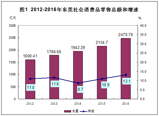 十八大以来,随着市场经济的不断发展,消费环境和人们的消费观念不断改善,消费市场日趋活跃,消费总量呈阶梯状增长。全市的社会消费品零售总额从2012年的1600.41亿元,到2015年突破2000亿大关,2016年实现社会消费品零售总额2470.78亿元。2013-2016年社会消费品零售总额年均增长11.1%,高于东莞GDP平均增速(8.4%)2.7个百分点。东莞市场消费需求强劲,购销活跃,呈现出持续、稳定增长的态势。