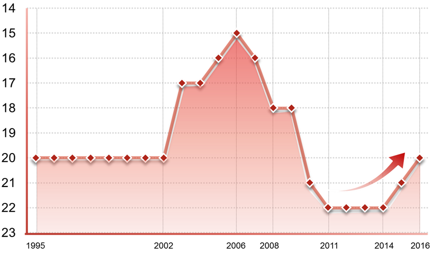 1995-2016年东莞经济总量全国排名情况图