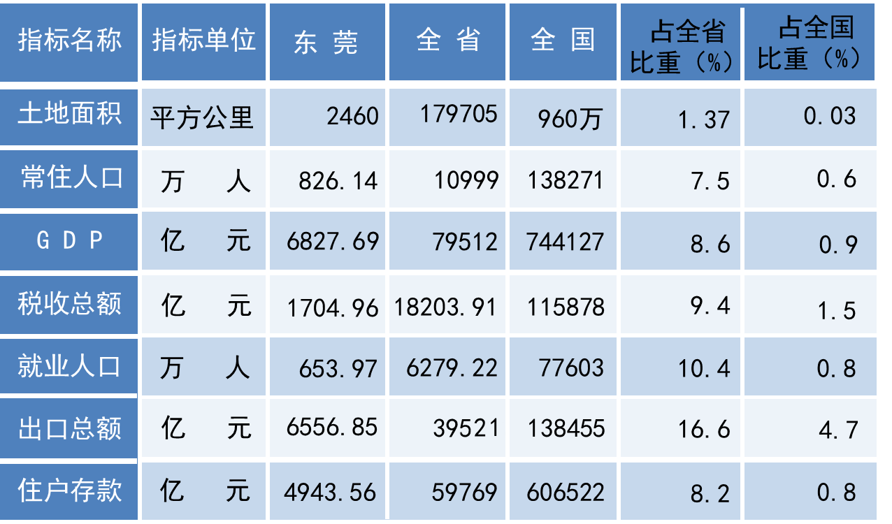 (三)东莞主要指标对全国贡献突出。东莞土地面积仅为2460平方公里,占全国的0.03%,然而,对全国的贡献突出。东莞常住人口占全国的0.6%,创造了全国0.9%的GDP,贡献了全国1.5%的税收,解决了全国0.8%劳动人口的就业问题,创造了全国4.7%的外汇收入,储蓄了全国0.8%的住户存款。所有贡献指标权重均超过面积20倍以上,“小牛拉大车”作用凸显。