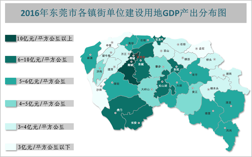 (二)两个镇街单位建设用地GDP产出超过十亿元。在发展达到一定规模后,东莞更加注重发展质量,注重单位产出效率,提倡集约发展、节约用地,提高经济发展的密度。2016年,莞城、南城2个镇街的单位建设用地GDP产出超过10亿元/平方公里,石龙、长安、松山湖、东坑、虎门和东城等6个镇街的单位建设用地GDP产出超过6亿元/平方公里,麻涌、石碣、高埗、凤岗、厚街、大朗、塘厦、常平和清溪等9个镇街的单位建设用地GDP产出超过5亿元/平方公里。