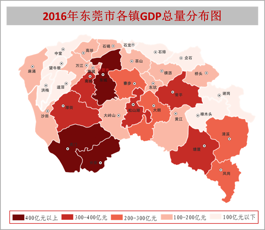 (一)镇域经济不断做大做强,规模进一步提升。2016年,全市33个镇街(含松山湖)平均经济总量超过200亿元,经济总量超400亿元、300亿元和100亿元的镇街再添新成员。其中东城进入400亿元俱乐部,常平、松山湖进入300亿元俱乐部,茶山进入100亿元俱乐部,以上4个镇街经济总量实现新跨越。在全市33个镇街(含松山湖)中,经济总量达400亿元以上的镇街有虎门、长安、东城3个,在300-400亿元之间的镇街有南城、厚街、塘厦、常平、松山湖5个,在200-300亿元之间的镇街有大朗、凤岗、寮步、清溪4个,在100-200亿元之间的镇街有12个,在50-100亿元之间的镇街有9个,全部镇街经济规模均超50亿元。