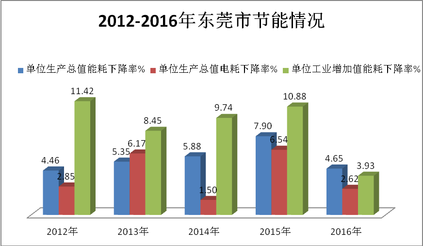 2016年,东莞全社会能源消费量2894.92万吨标准煤,单位GDP能耗0.427吨标准煤/万元,比2012年累计下降21.8%,年均下降6.0%,降幅居全省第一位。电耗方面,也有不俗的成绩。2016年,单位生产总值电耗比2012年累计降低15.9%,年均下降4.2%。