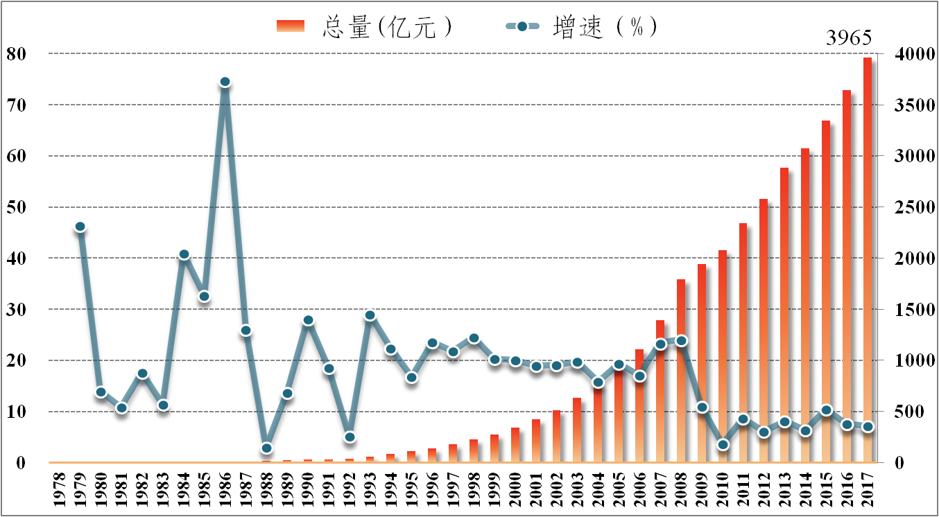 1978-2017年东莞服务业总量及增速图