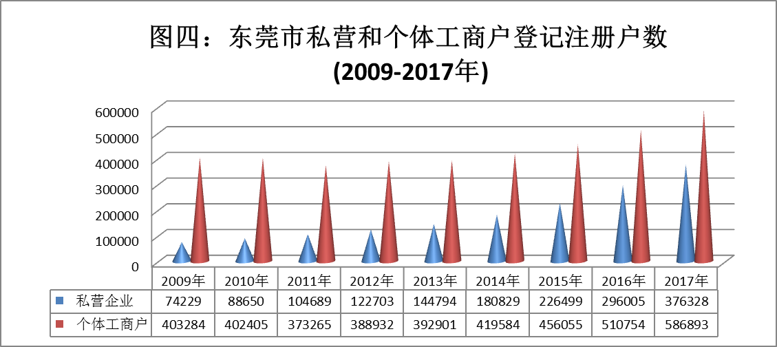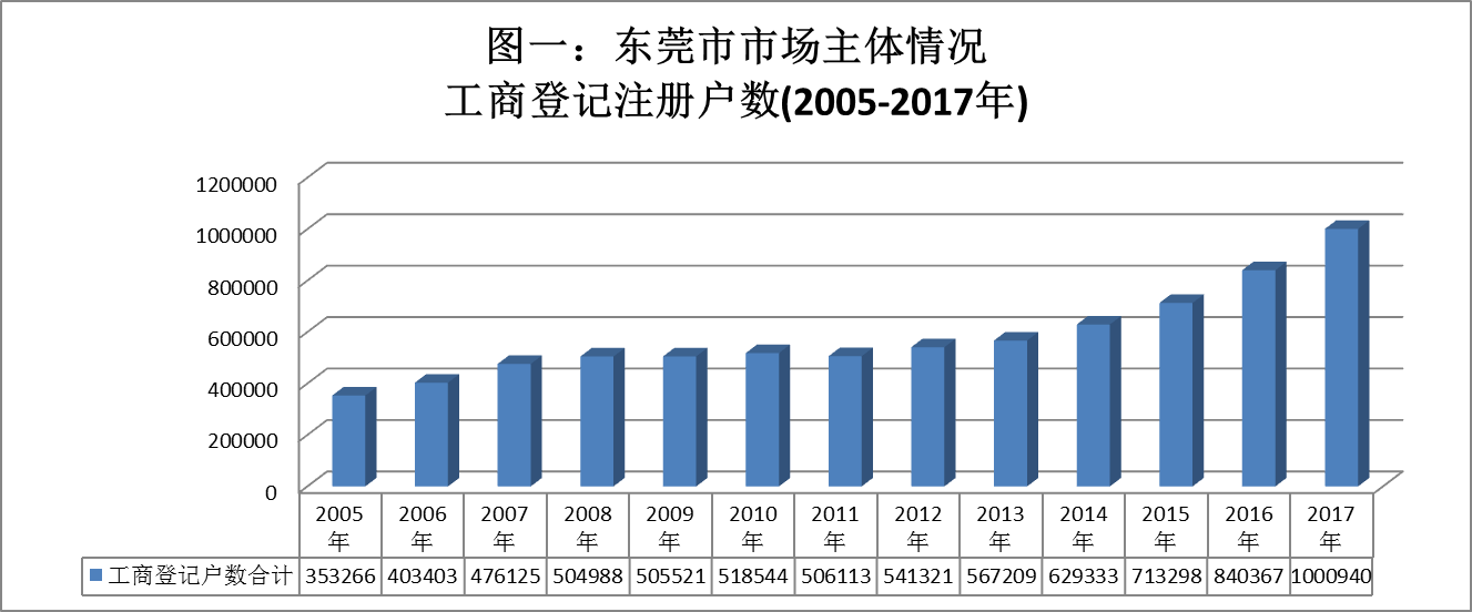 截至2017年末,工商登记注册户数达100.09万家(其中企业数41.33万家),市场主体总量和企业数量均位居广东省地级市首位。这是改革开放带来的政策红利,使得东莞市场主体实现井喷式的大发展。截至2017年底,东莞市工业企业单位数23.61万家,是1978年的183倍。商业机构(批零贸易企业和个体户)达58.15万家,是1979年的236倍。