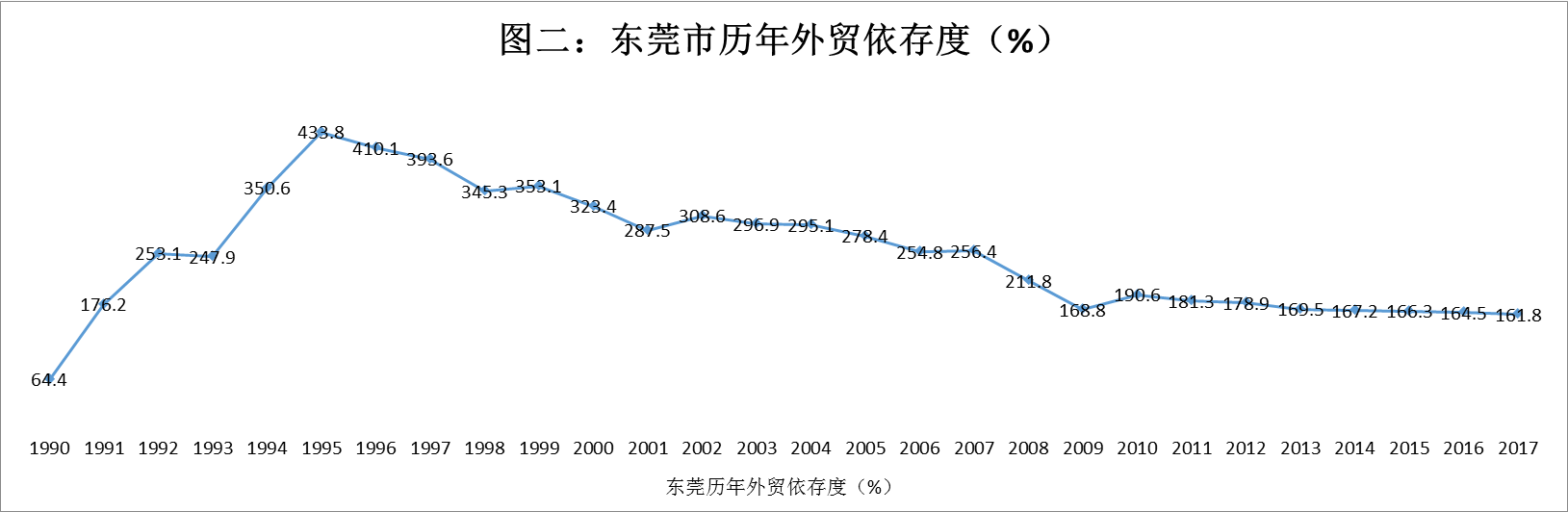 说起这个时间,就不得不提到2009年国际金融危机爆发。而东莞受到冲击大,主要是我们的外贸依存度高。东莞外贸依存度最早可以追溯到1990年,1990年东莞外贸依存度为64.4%,随着改革开放的深入和“世界工厂”的逐步壮大,外贸依存度急速飙升,到1995年达到峰值的433.8%,随后一路震荡回落,到2009年下降到168.8%,表明东莞严重依靠外需的时代逐步结束。