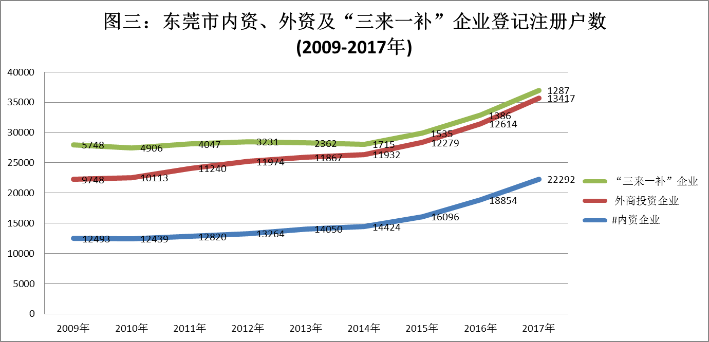 由于“三来一补”3企业逐渐增多,东莞的工业企业数从1985年的4187家,1992年增加到11639家,是1985年的2.78倍。