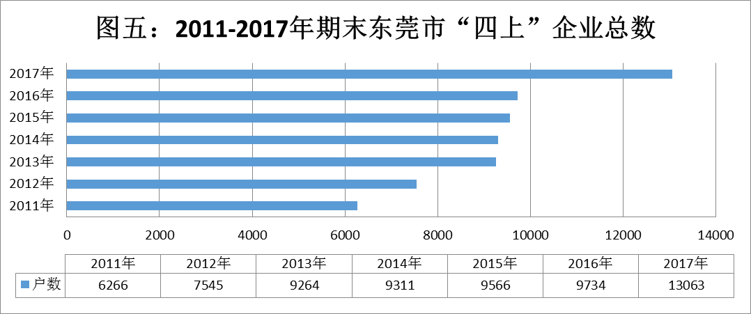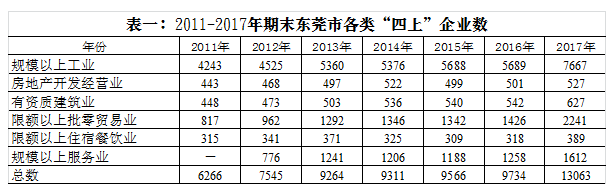 截至2017年底,东莞市“四上”企业共有13063家,其中规模以上工业企业7667 家,资质以上建筑业和房地产企业1154家,限额以上批零住餐企业2630家,规模以上服务业1612家,分别占“四上”企业总数的58.7%、8.8%、20.1%、12.3%。