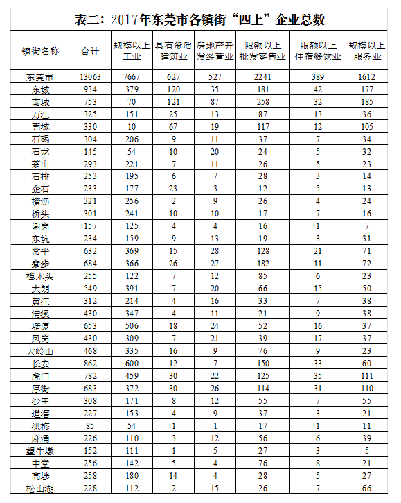 截至2017年末,东莞市“四上”企业法人单位数总量超过500家的镇街有9个,分别是东城、长安、虎门、南城、厚街、寮步、塘厦、常平和大朗。九个镇街“四上”企业法人单位合计6532家,占全市“四上”企业法人单位总数的50.0%。其中,规模以上工业超过500家的两个镇街分别为长安和塘厦,分别为600家和506家,占全市规模以上工业比重分别为7.8%、6.6%;具有资质的建筑业集中在东城和南城,分别有120家、121家,占全市具有资质的建筑业比重分别为19.1%、19.3%;房地产开发经营业主要集中在南城87家,占全市房地产开发经营业比重为16.5%;限额以上批零贸易业过百家的企业主要集中南城、寮步、东城、长安、常平、虎门、莞城、厚街等八个镇街,合计1255 家,占全市限额以上批零贸易业比重56.0%;限额以上住宿餐饮业超过30家企业的镇街有东城、虎门、长安、南城、厚街,合计173家,占全市限额以上住宿餐饮业比重为44.5%;规模以上服务业过百家的企业主要集中南城、东城、虎门、厚街、莞城等五个镇街,合计688家,占全市规模以上服务业比重42.7%。(详见表二)