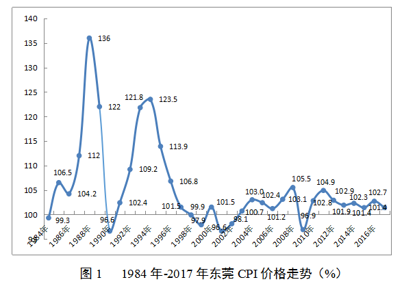 改革开放40年,是国家经济腾飞的40年,也是东莞经济社会发展转型升级的40年。改革开放以来,东莞市场物价运行发生巨大变化,居民消费价格指数(CPI)呈现从波动起伏到平稳温和的走势。