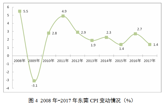 十八大以来,国家始终以解决制约经济持续健康发展的重大结构性问题为重点,积极处理好政府与市场的关系。国家经济结构转型升级,经济增速放缓,对抑制物价过高上涨产生了积极影响。这个阶段东莞CPI走势呈逐年温和上涨态势,年均上涨2.1%。其中,2012年涨幅最大,较上年上涨2.9个百分点,2015年和2017年价格位于相对低位,均小幅上涨1.4个百分点。